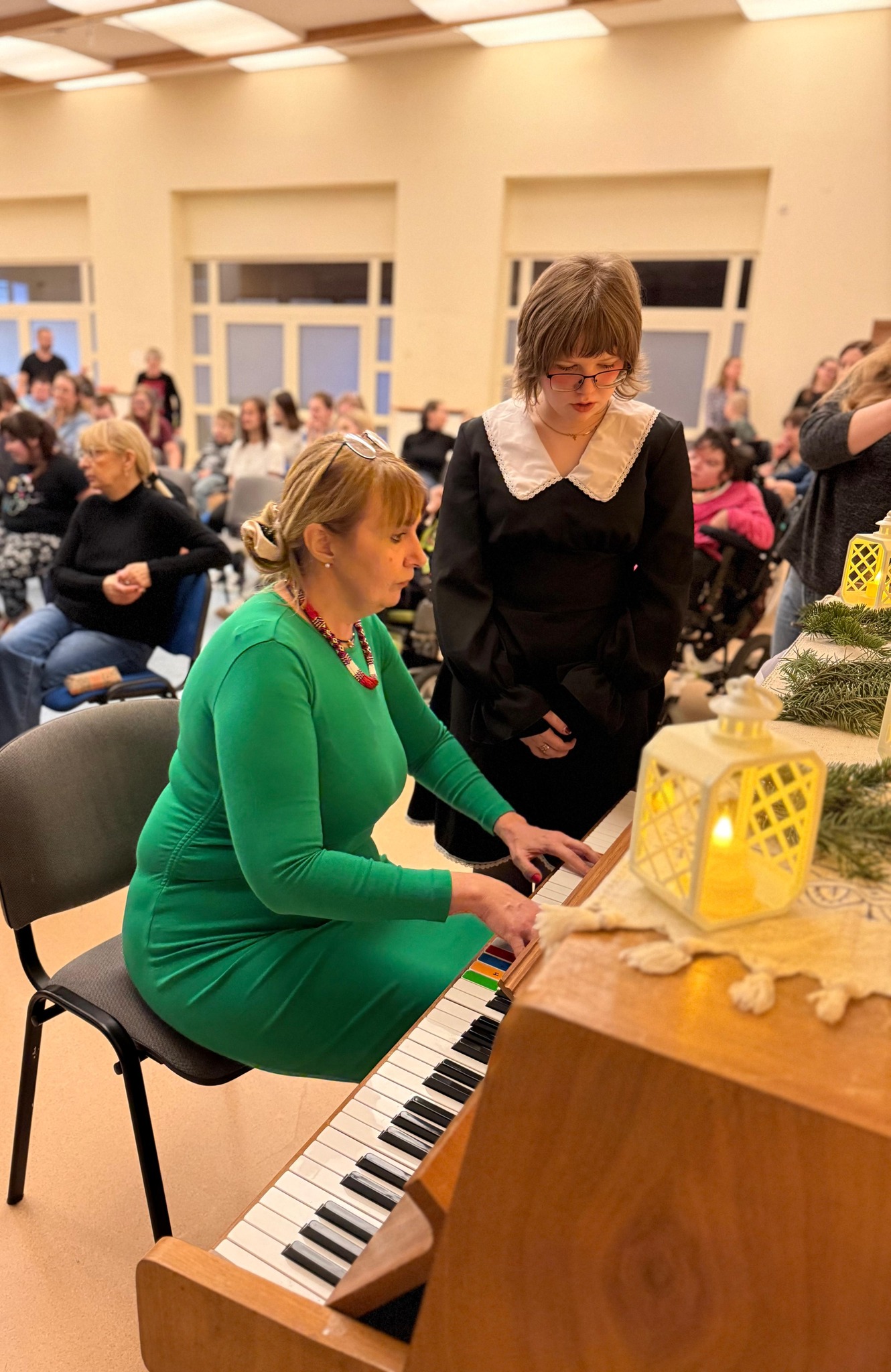 Występy choreograficzne były jednym z głównych punktów programu. Artyści zaprezentowali układy taneczne, nawiązujące do ukraińskiego folkloru. Taniec, jako uniwersalny język, z pewnością wywołał duże emocje i zaangażowanie wśród uczniów. Oprawa muzyczna była wyjątkowo bogata, z wykorzystaniem klasycznych i popularnych instrumentów: gitara, fortepian, wiolonczela oraz inne. Odbiór muzyki granej na żywo ma udowodnione działanie relaksujące, stymulujące i poprawiające koncentrację uczestników. Repertuar występujących obejmował kolędy oraz znane ukraińskie utwory muzyczne. Śpiewanie kolęd, zarówno ukraińskich, jak i polskich, tworzył magiczną, przedświąteczną atmosferę, podkreślając bliskość kulturową w okresie Bożego Narodzenia.